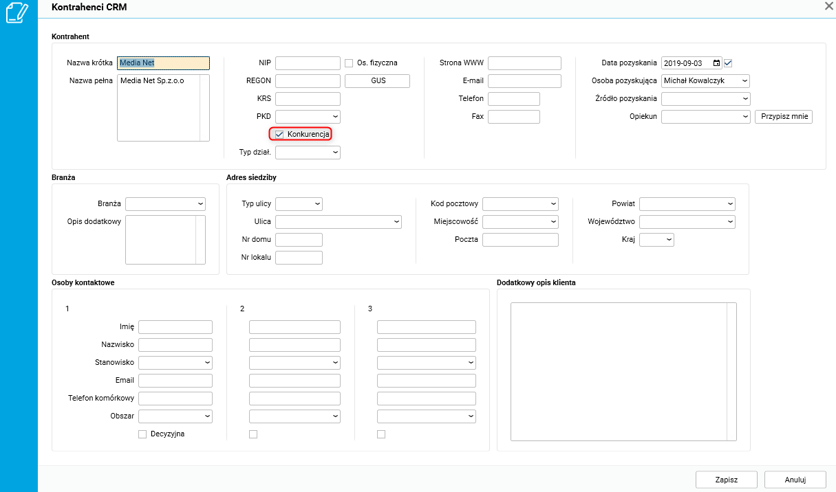 W formatce edycyjnej słownika Kontrahenci CRM dodano pole wyboru Konkurencja. Za jego pomocą możemy oznaczać wybranych kontrahentów jako konkurencję.