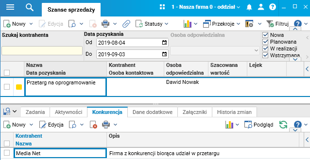 W słowniku Szanse sprzedaży został natomiast dodany szczegół Konkurencja. W szczególe tym można dodawać podmioty konkurujące o określoną szansę sprzedaży. W polu Opis można ponadto dodać informację dotyczącą konkurującego podmiotu (np. wysokość oferty, jeśli jest znana, oraz mocne strony konkurencji).