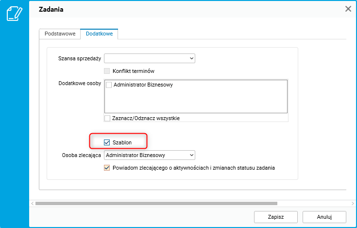 Jeżeli użytkownik podczas tworzenia zadania przewiduje, że w przyszłości będzie tworzył podobne, może oznaczyć je jako szablon. Opcja ta dostępna jest w oknie edycyjnym słownika Zadania, w zakładce Dodatkowe.