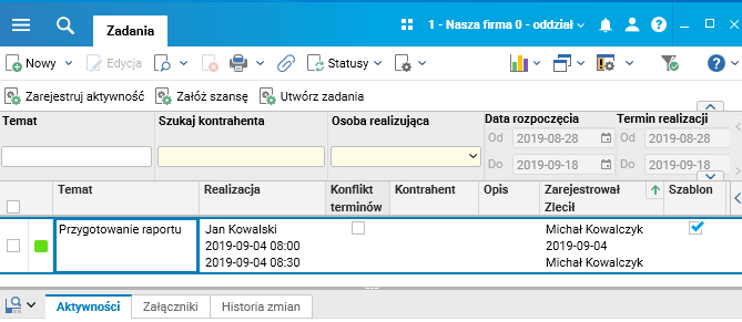 Kolejne zadania użytkownik będzie wtedy mógł dodawać na podstawie utworzonego uprzednio szablonu, bez konieczności uzupełniania wszystkich danych.