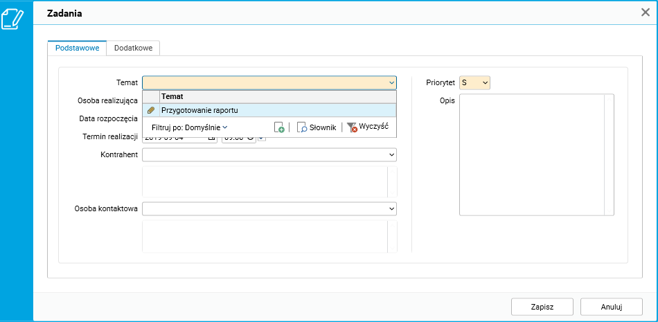 Podczas tworzenia zadania na podstawie szablonu pola w oknie edycyjnym uzupełniają się automatycznie, możemy jednak edytować ich zawartość.