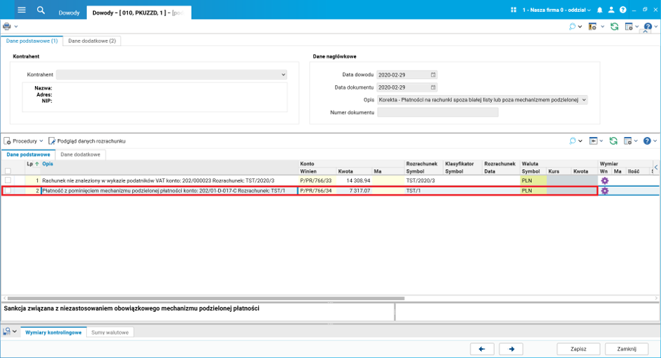 Kwota korekty zostanie zaksięgowana na konto pozabilansowe P/PR/766/34 jako przejściowa różnica pomiędzy wartościami bilansowymi a podatkowymi z tyt. sankcji związanych z niezastosowaniem obowiązkowego mechanizmu podzielonej płatności.