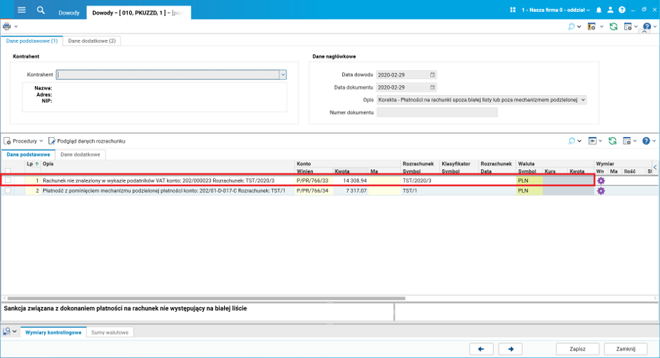 Rys. 5. Naliczona korekta z tytułu płatności na rachunek poza białą listą