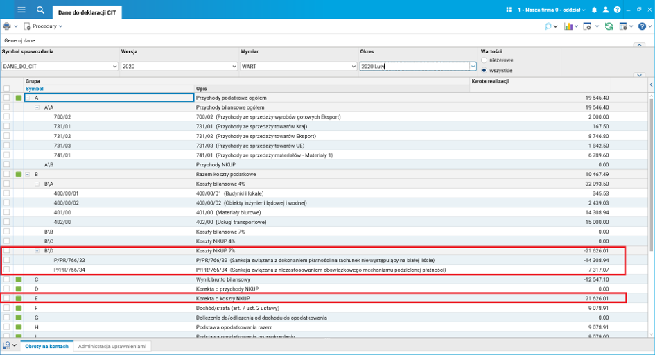 Po zaksięgowaniu korekt z tytułu płatności z pominięciem podzielonej płatności (Przykład 1) i z tytułu płatności na rachunek spoza białej listy (Przykład 2) kwoty korekt będą widoczne na raporcie Dane do deklaracji CIT. Na tej podstawie dział księgowości może przygotować deklarację CIT.