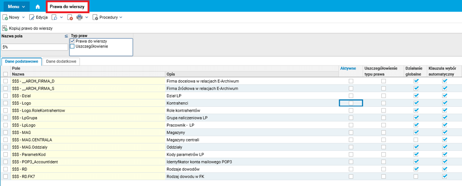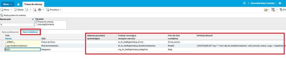 System umożliwia również definiowanie nowych reguł praw do wierszy, indywidulanie dostosowanych do wymogów i specyfiki danego wdrożenia. Do tego celu służy zakładka Dane dodatkowe, gdzie za pomocą pól i ich odpowiednej konfiguracji można określać zakres widoczności zbioru danych.