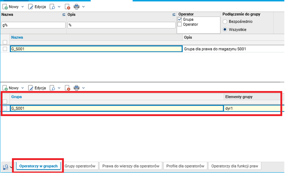 Aby usprawnić te czynności, można skonfigurować grupę operatorów (np. Dyrektor sprzedaży). I do grupy przypisać operatorów, którzy powinni mieć uprawnienia dyrektora sprzedaży. Następnie do grupy możemy przypisać prawa do magazynów. To rozwiązanie sprawi, że w przypadku zmian organizacyjnych w przedsiębiorstwie nie trzeba będzie wykonywać zmian w konfiguracji na każdym użytkowniku z osobna, a tylko na grupie, do której on należy. Zaletą tej metody jest również to, że można taką grupę przydzielić innym użytkownikom pełniącym inne role funkcjonalne w systemie, ale mającym prawa do tego samego magazynu (magazynów).