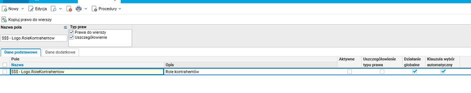 Aby skonfigurować takie ustawienia należy uruchomić prawa do ról kontrahenta. Czynności są analogiczne jak w poprzednim przykładzie z tą różnicą, że teraz konfigurujemy prawo do wiersza dla pola Rola kontrahenta. W słowniku Prawa do wierszy odnajdujemy regułę „$$$ – Logo.RoleKontrahentow”, a następnie kopiujemy ją na regułę wdrożeniową i uruchamiamy funkcjonalność.