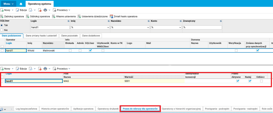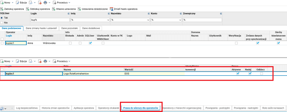W następnym kroku przydzielamy prawo do roli do użytkownika. Uwaga! Z chwilą włączenia prawa wszyscy operatorzy, którzy nie zostali przypisani do żadnej z ról, stracą widoczność do wszystkich rekordów. Dlatego trzeba niezwłocznie przypisać operatorom prawa do odpowiednich ról.