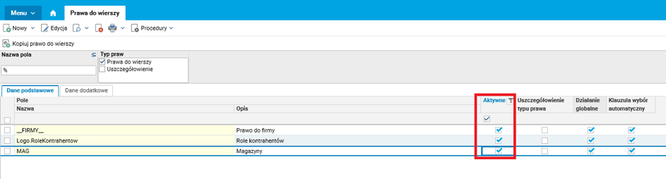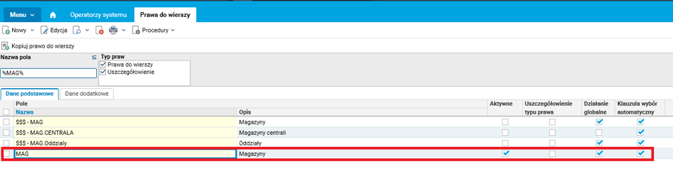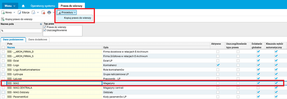 W pierwszej kolejności należy otworzyć słownik Prawa do wierszy. Po otwarciu odnaleźć w nim prekonfigurowaną regułę „$$$ – MAG”. Jest to predefiniowana konfiguracja prawa do pola Magazyn (Mag). Następnie na tej regule należy użyć procedury Kopiuj prawo do wierszy, aby utworzyć regułę wdrożeniową i włączyć ją (parametr Aktywne).