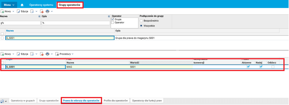 Rys. 9. Konfiguracja grupy operatorów oraz nadanie jej prawa do wiersza dla pola MAG