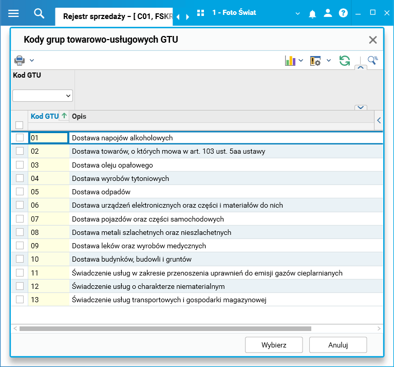 W module FK utworzono nowy słownik Kody grup towarowo-usługowych GTU zawierający listę grup towarów i usług. Informacje te są wykorzystywane w pliku dotyczącym ewidencji sprzedaży JPK w sekcji SprzedazWiersz (pola od GTU_01 do GTU_13). Kody te są dostępne w ewidencji sprzedaży w modułach LS i FK.
