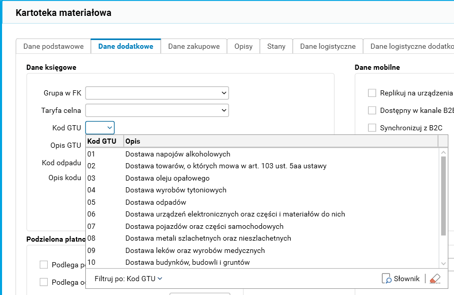 Kody GTU można przypisać do pozycji asortymentowych w kartotece materiałowej w module LS oraz do słownika usług wykorzystywanych w fakturowaniu usługowym w module FK. Dzięki temu mogą być inicjowane automatycznie na dokumentach sprzedaży w obu modułach.
