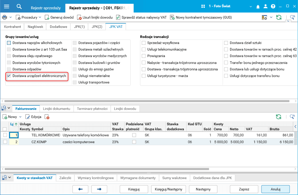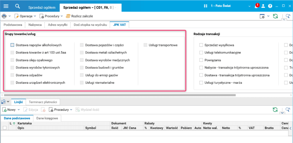 Dane o grupach towarów i usług oraz o rodzajach transakcji można przeglądać i edytować w szczególe Dane dodatkowe dla JPK. Są one dostępne dopiero po zapisaniu nagłówka dokumentu sprzedaży.