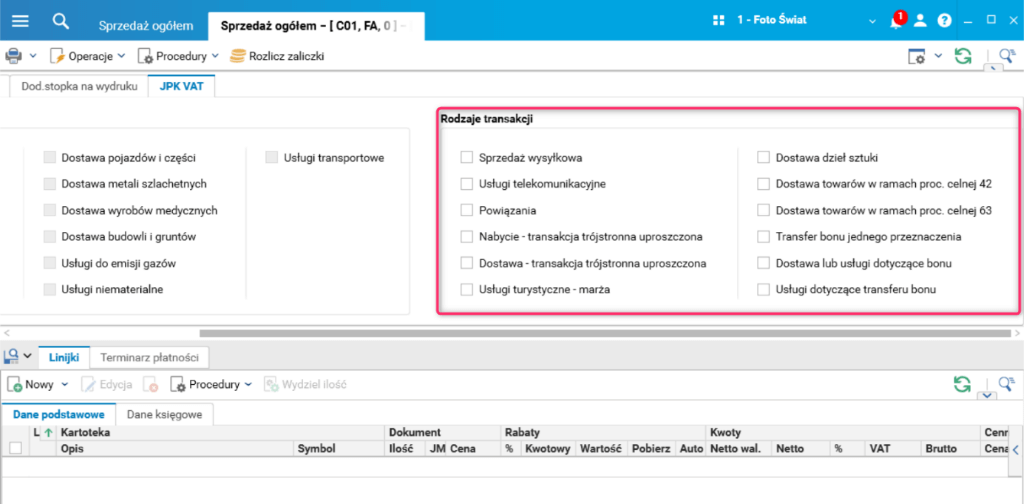 W tej samej zakładce JPK VAT dodano też sekcję Rodzaje transakcji, która służy do oznaczenia dokumentu sprzedaży rodzajem transakcji.