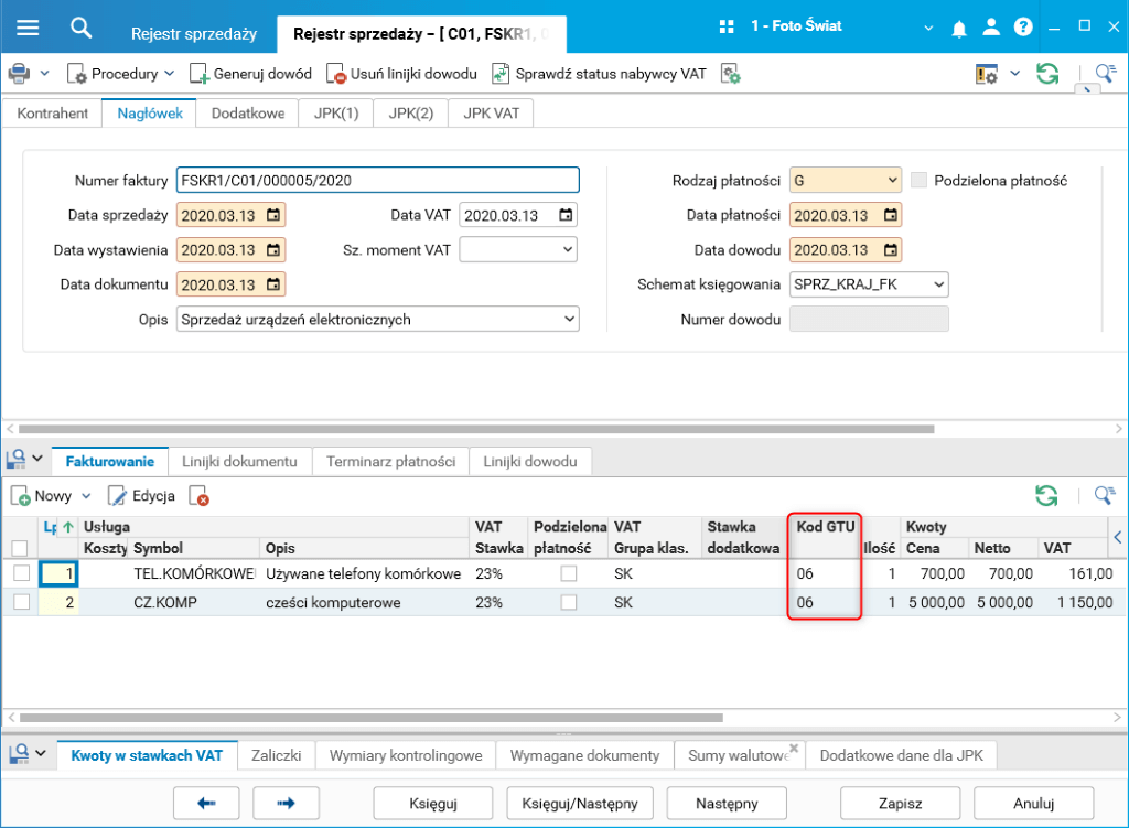 Rys. 8. Kody GTU w nagłówku dokumentu sprzedaży w module FK