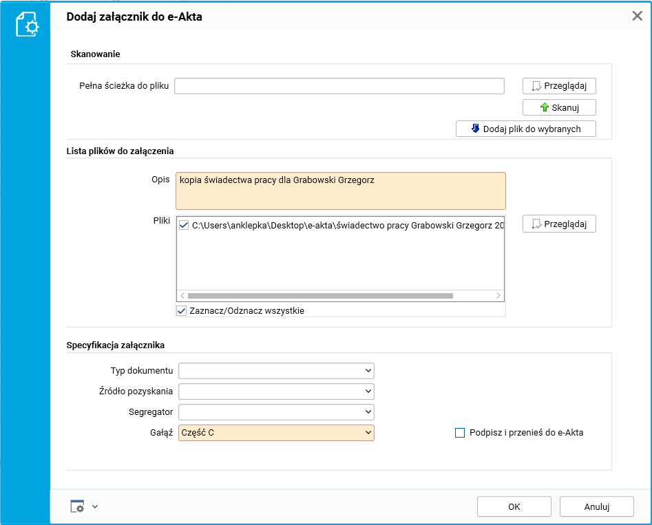 Dokumenty importowane do programu w postaci zeskanowanych dokumentów papierowych lub gotowych załączników w postaci plików umieszczonych na dysku można zapisać w module za pomocą procedury Dodaj załącznik do e-Akta dostępnej w słowniku Pracownicy – umowy(etaty).