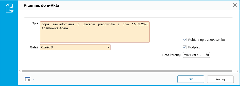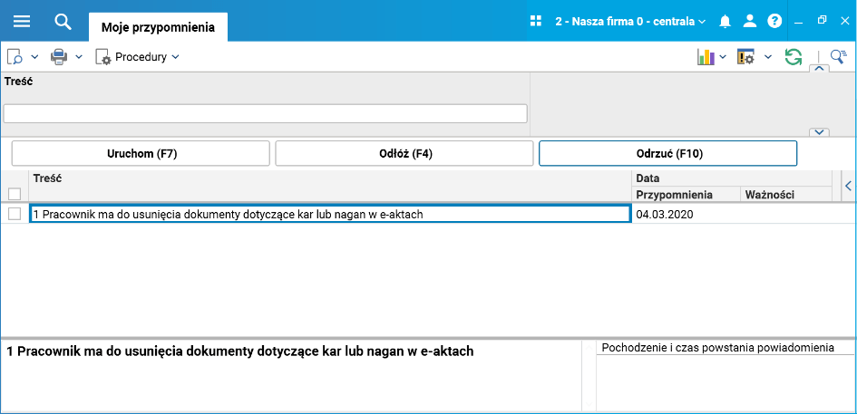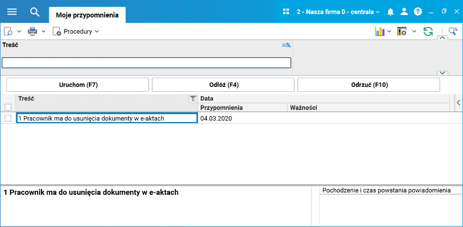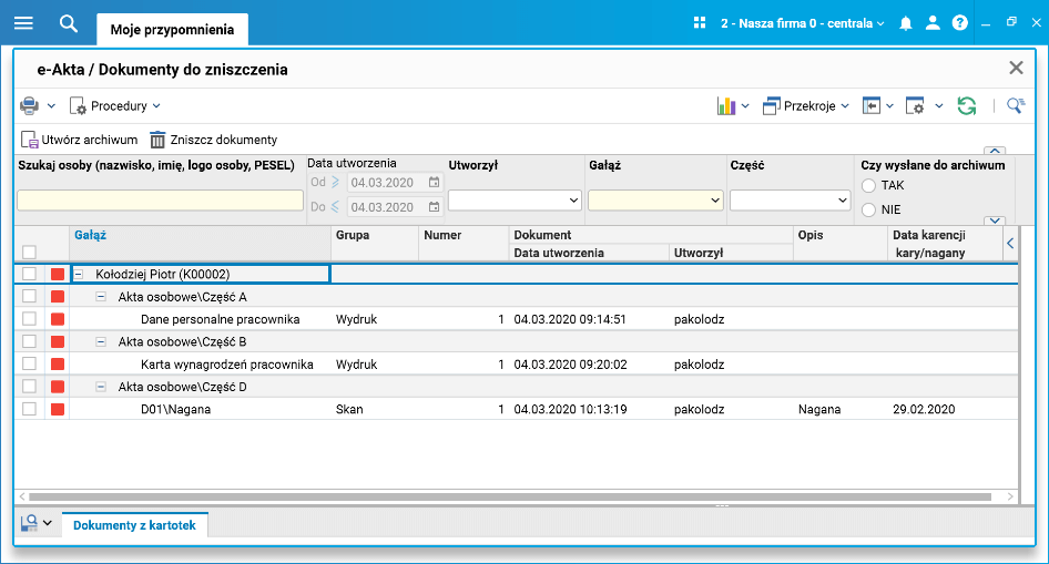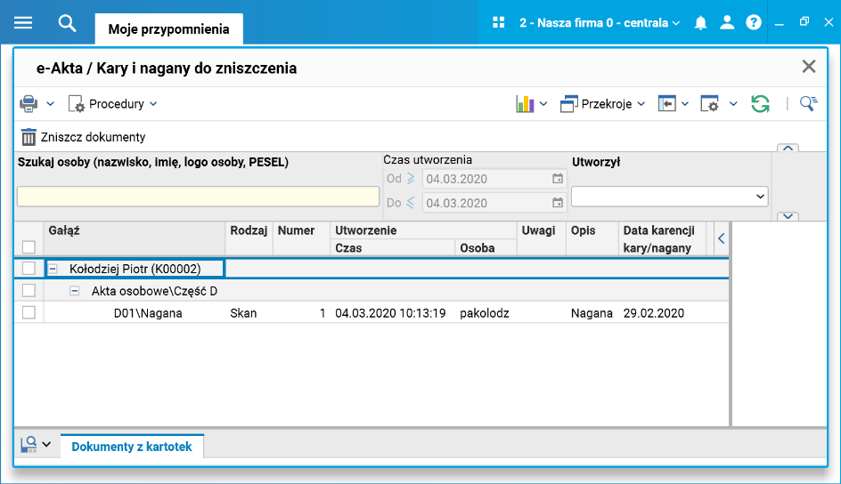 Dokumentacja zgromadzona w e-aktach powinna zostać usunięta po przekroczeniu terminu przechowywania określonego w przepisach. Ponieważ okres przechowywania dokumentów dotyczących kar i nagan może być krótszy niż okres przechowywania całości dokumentacji, dlatego powstały dwa oddzielne przypomnienia.
