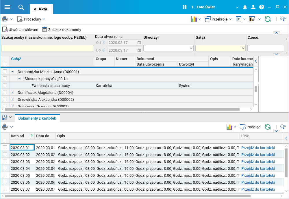Dane dotyczące wniosków urlopowych oraz ewidencji czasu pracy (czyli dane pochodzące z kartotek pracownika) są inaczej prezentowane w słowniku e-Akta niż dokumenty plikowe. Bez względu na ilość danych o danym typie kartoteki (np. wniosków o urlop wypoczynkowy) dla danego pracownika w kolumnie Gałąź słownika e-Akta widoczny będzie jeden rekord odpowiadający kategorii danych. Poszczególne dane z tej kategorii (np. wnioski urlopowe) są prezentowane w szczególe Dokumenty z kartotek słownika e-Akta.