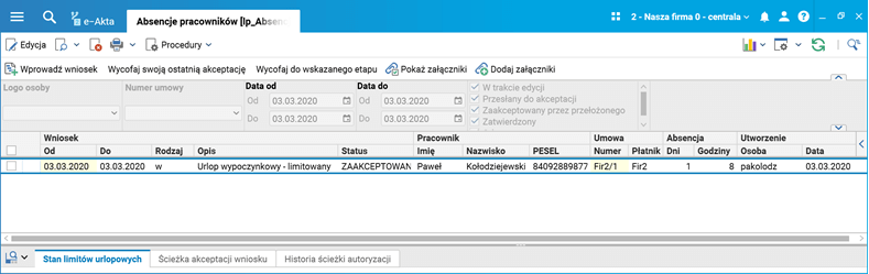 ·        Wnioski urlopowe – przy akceptacji wniosków urlopowych ostatni krok autoryzacji wniosku powoduje, że informacja o nim trafia do modułu e-Akta. Z kolei wycofanie wniosku, usuwa informacje w e-aktach.