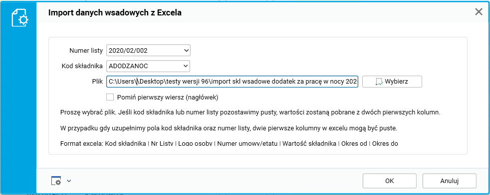 Rozbudowano mechanizm importu składników wsadowych z pliku excel na wskazaną listę płac o obsługę kolumn zawierających informację o okresie kosztowym składnika płacowego.