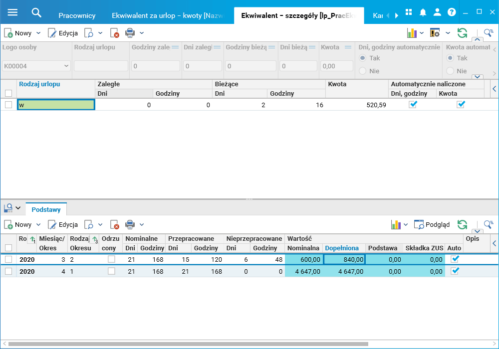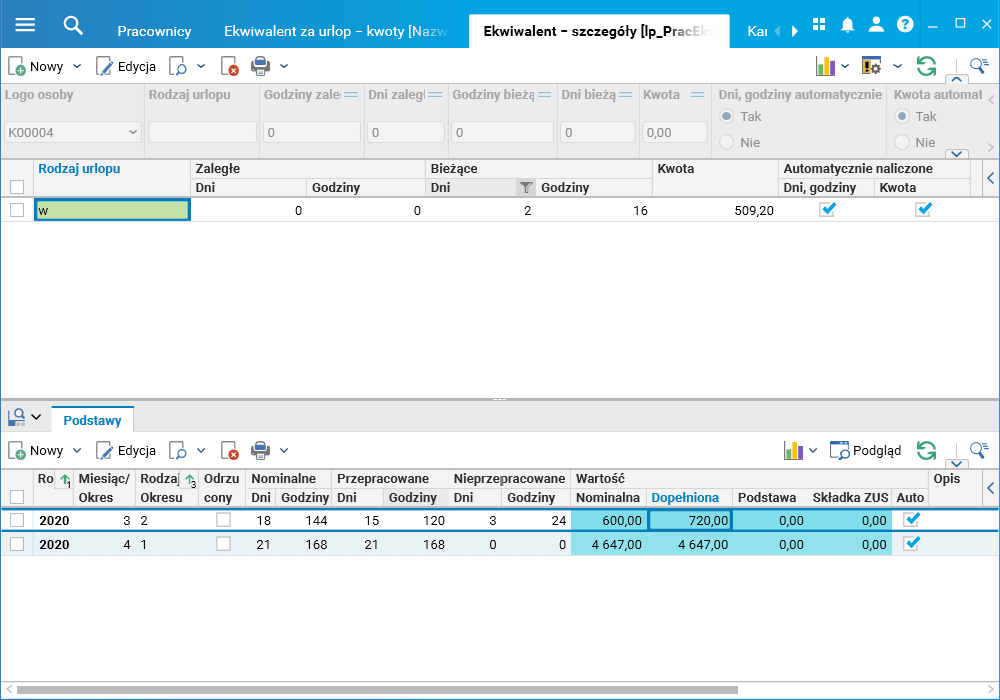 Umożliwiono takie skonfigurowanie składników płacowych uwzględnianych w podstawie ekwiwalentu za niewykorzystany urlop wypoczynkowy, by składniki wypłacone za pierwszy miesiącu zatrudnienia były uzupełniane do wysokości wynikającej z okresu zatrudnienia.