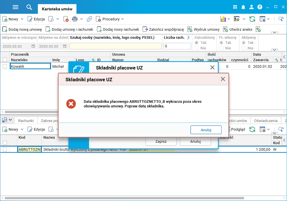 Podczas dodawania składników płacowych w szczególe Składniki płacowe UZ słownika Kartoteka umów system weryfikuje, czy daty obowiązywania składników mieszczą się w zakresie obowiązywania umowy bezosobowej, do której składnik jest dodawany.