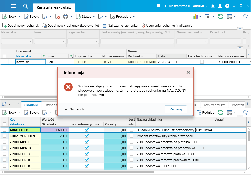 Dodano kontrole poprawności dat składników umowy zlecenia i statusu tych składników. Kontrole te działają podczas wprowadzania bądź importu składników do umowy bezosobowej oraz podczas zmiany statusu rachunku.