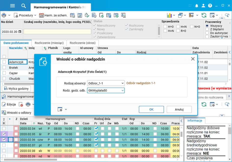 Ułatwiono rejestrację odbioru godzin nadliczbowych we wskazanych dniach, w których pracownik nie przepracował nominalnego czasu pracy. Ułatwienie polega na automatycznym wygenerowaniu wniosków o odbiór godzin nadliczbowych dla wskazanych dni.