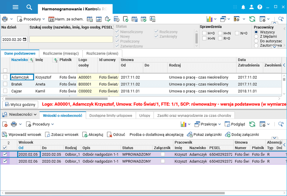 Rys. Zarejestrowane wnioski o odbiór nadgodzin w szczególe Wnioski o nieobecność w słowniku Harmonogramowanie i Kontrola RCP