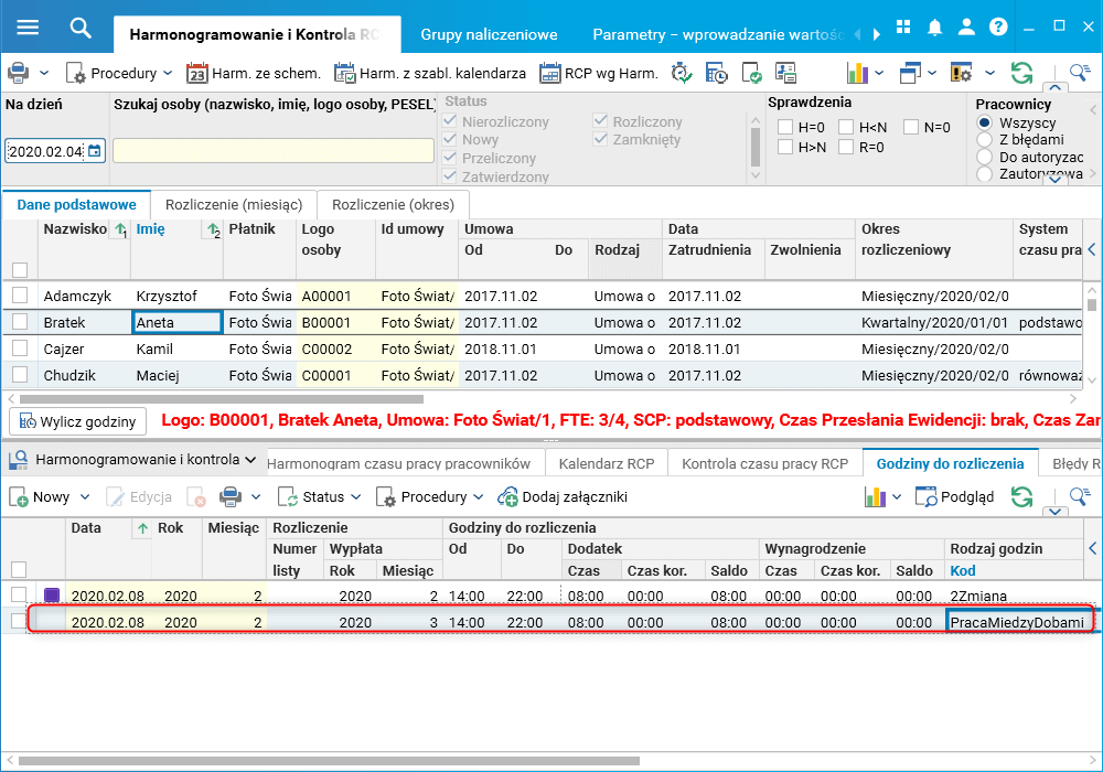 Rys. Rok i miesiąc rozliczenia godzin typu PracaMiedzyDobami w szczególe Godziny do rozliczenia słownika Harmonogramowanie i Kontrola RCP