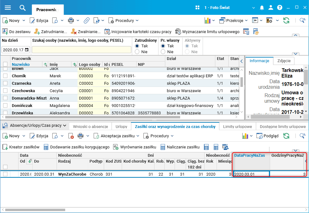 Obecnie możliwa jest rejestracja pracy i świadczenia chorobowego w jednym dniu. Dla rejestrowanych absencji chorobowych dodane zostały kolumny, w których zapisana jest data (pole DataPracyNaZas), której dotyczy jednoczesna praca, oraz liczba godzin pracy (pole GodzinyPracyNaZas w szczególe Zasiłki oraz wynagrodzenie za czas choroby słownika Pracownicy -umowy(etaty)). Pola te są domyślnie niewidoczne.