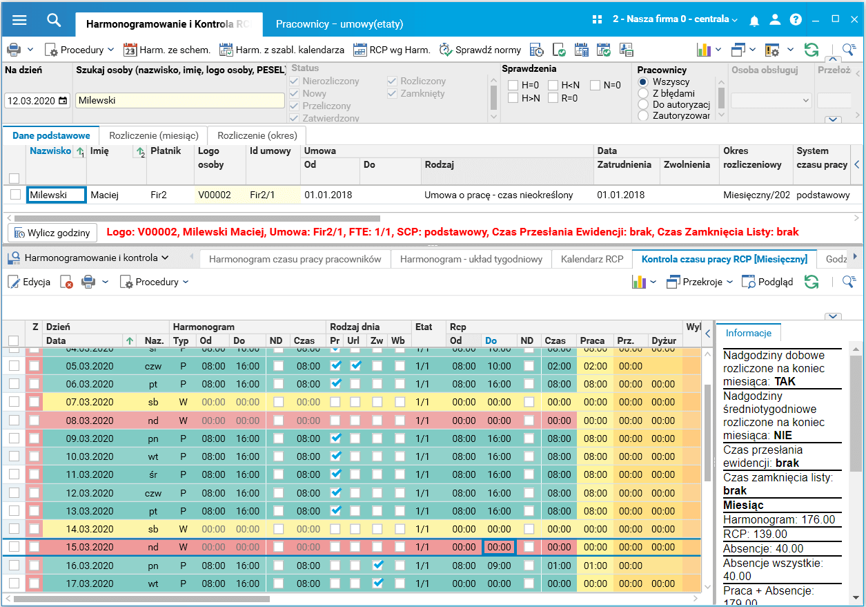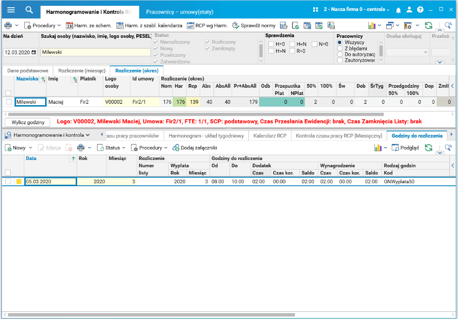 Rys. Wyliczone nadgodziny dobowe dla urlopu łączonego z pracą oraz brak nadgodzin średniotygodniowych dla zasiłku łączonego z pracą