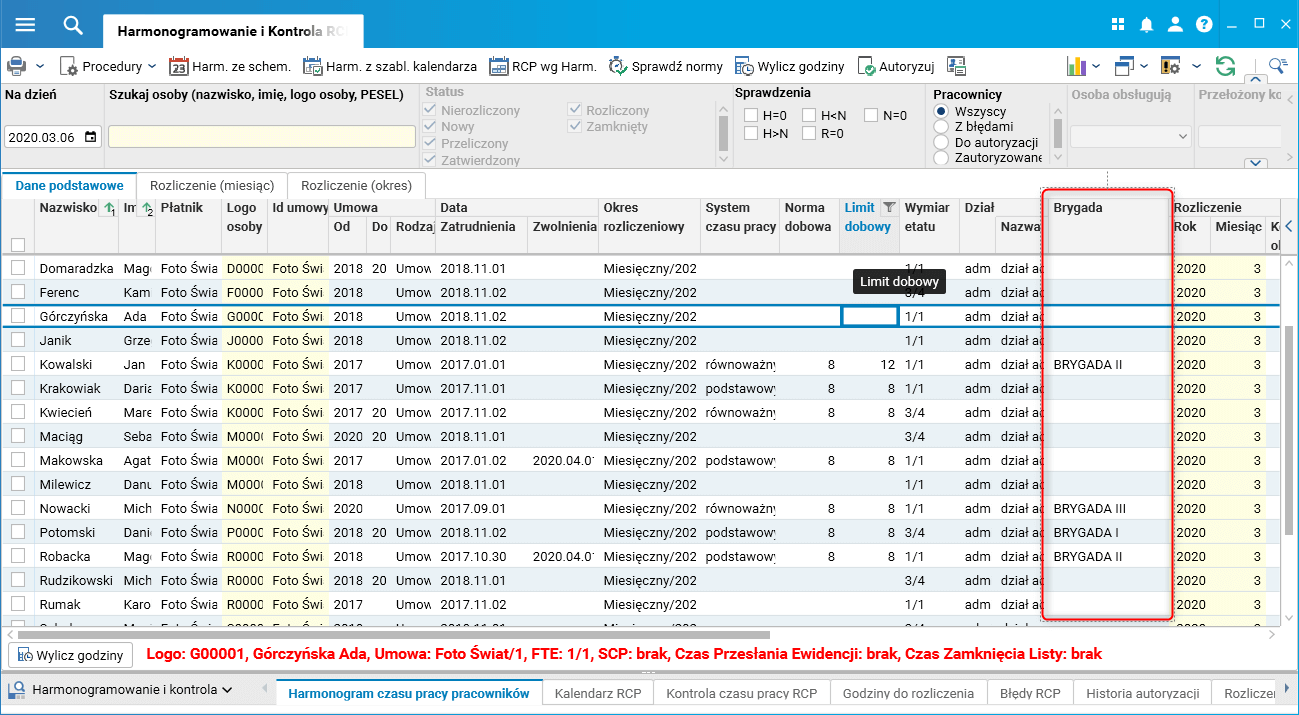 W słowniku Harmonogramowanie i Kontrola RCP dodano kolumnę Brygada umożliwiającą filtrowanie danych dotyczących czasu pracy pracowników pracujących w brygadach zdefiniowanych w organizacji. Jest to o tyle istotne, że po wygenerowaniu harmonogramu dla pracowników należących do danej brygady będzie można wyświetlić odpowiednie grupy pracowników (przypisanych do brygady).