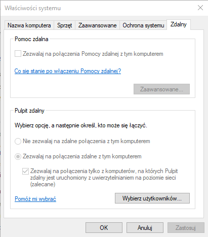 Dodatkowo w przypadku usługi pulpitu zdalnego możesz wymusić połączenie z zaufanych komputerów na poziomie sieci do danego komputera. - Konfiguracja routera – jak wspomniano powyżej ważne jest aby środowisko z jakiego łączy się pracownik do firmy, również było możliwie najbezpieczniejsze. Oczywiście wychodząc od podstawowych kwestii pracy z komputera prywatnego najważniejsze jest aby komputer był na bieżąco aktualizowany, co pozwala wyeliminować dużą część podatności bezpieczeństwa.