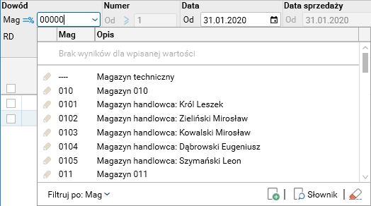 W przypadku, gdy wpisana fraza nie daje żadnych wyników pasujących do niej, wyświetlana jest na górze informacja Brak wyników dla wpisanej wartości, a poniżej, oddzielone separatorem, pokazane są wszystkie wartości listy wyboru.