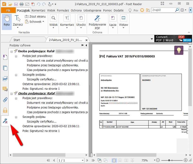 Rys. Wgląd w informacje o podpisach pliku PDF w aplikacji Foxit Reader