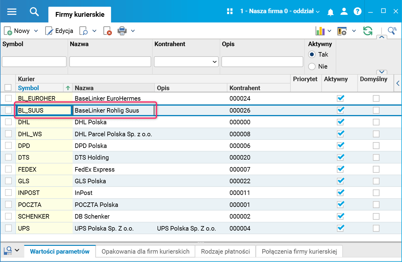 W związku z powyższymi zamianami w słowniku Firmy kurierskie została skonfigurowana obsługa kuriera Rohlig SUUS Logistics – dodano nowy wpis dla tego przewoźnika o symbolu: BL_SUUS.