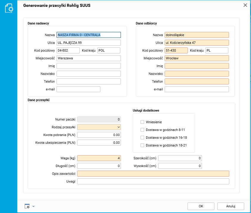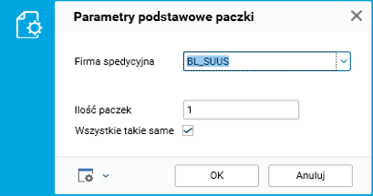 Dla firmy Rohling SUUS Logistics zdefiniowano również formularz tworzenia przesyłki kurierskiej zgodnie z informacjami wymaganymi przez tego przewoźnika. Formularz wyświetlony zostanie po uruchomieniu procedury Generuj paczki kurierskie, a następnie wybraniu w jej parametrach symbolu przewoźnika BL_SUUS.