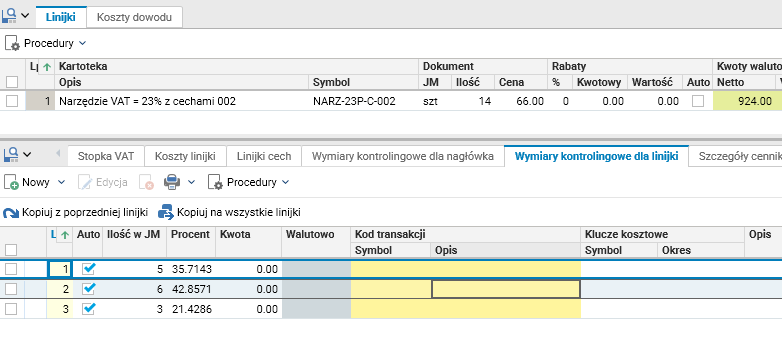 Dotychczas moduł LS pozwalał na wprowadzanie wartości wymiaru kontrolingowego dla linijki dokumentu jedynie w formie kwoty lub udziału procentowego. Przykładowo, użytkownik mógł podać udziały procentowe, na podstawie których automatycznie wyliczane były kwoty. W bieżącej wersji dodano możliwość wprowadzenia wartości wymiaru kontrolingowego w postaci ilości.