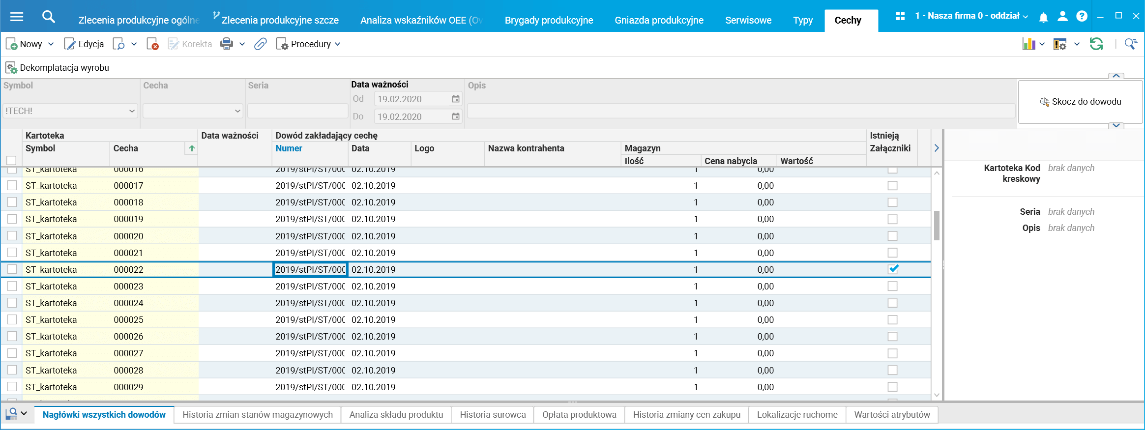 Załączniki powiązane są z cechami. Po dodaniu ich z poziomu dokumentu przychodowego są widoczne również w słowniku Cechy. Tu również dodana została kolumna Istnieją załączniki (widoczność kolumny należy włączyć w ustawieniach tabeli). Filtrując wyświetlone w słowniku cechy po symbolu (kodzie) indeksu asortymentowego lub bezpośrednio po konkretnej cesze, możliwe jest zawężenie ilości wyświetlanych wierszy do wszystkich cech wybranego asortymentu lub do jednej pozycji związanej z podaną w filtrze konkretną cechą. Dodanie pliku lub przeglądanie podpiętych plików do cechy jest możliwe po wybraniu akcji Załączniki (ikona spinacza).