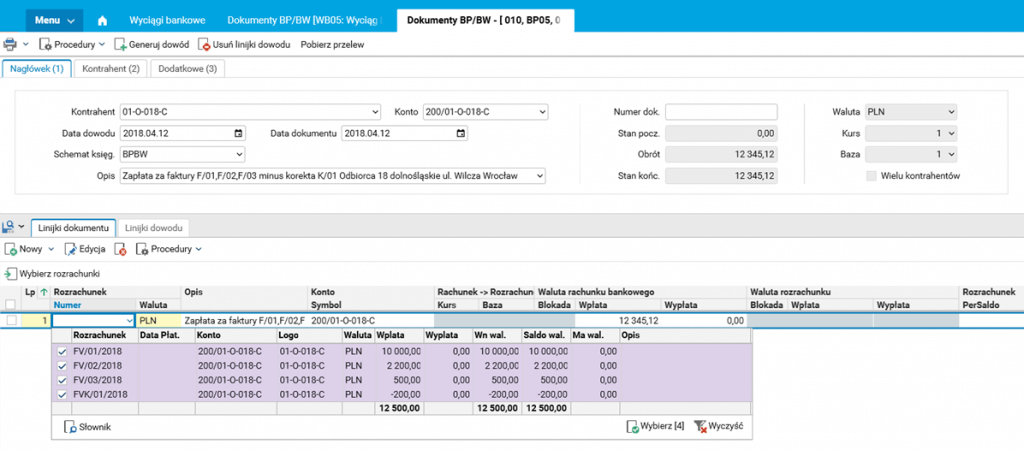 Analizujemy ten sam przypadek: odbiorca wpłaca kwotę 12 345,12 tytułem „Zapłata za faktury FV/01/2018, FV/02/2018, FV/03/2018 minus korekta FVK/01/2018”.