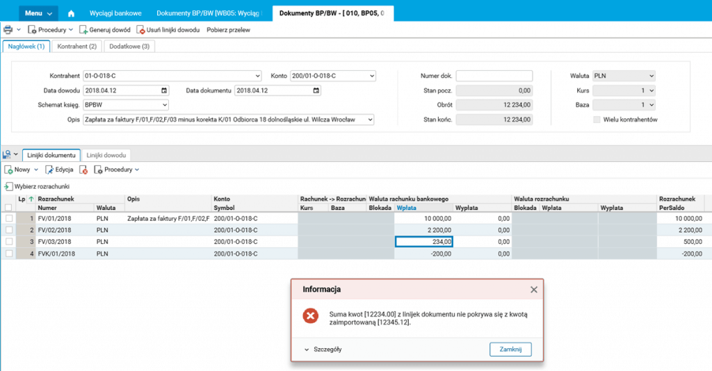 Suma wskazanych rozrachunków (12 500,00 zł) jest większa niż zaimportowana kwota wpłaty (12 345,12 zł), dlatego użytkownik musi zmniejszyć wartość jednej z faktur (czyli zarejestrować płatność częściową). Robi to, ręcznie edytując kwotę w linijce dokumentu. W naszym przykładzie użytkownik pomniejszył kwotę zapłaty za fakturę FV/03/2018, której nierozliczone saldo wynosiło 500 zł, wprowadzając wartość 234 zł.