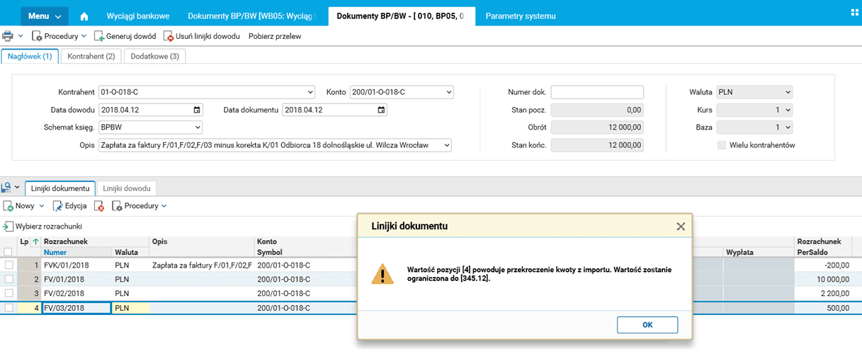 W przypadku kontroli kwoty po wprowadzeniu linijki dokumentu bankowego sprawdzane jest aktualne saldo rozliczanych faktur, liczone narastająco we wszystkich linijkach tego dokumentu i porównywane z kwotą zaimportowaną z banku. Jeśli kwota ta zostanie przekroczona, zapłata za ostatnią fakturę będzie pomniejszana tak, by ogólne saldo wszystkich wpłat/wypłat było zgodne z importem. O pomniejszeniu kwoty ostatniej faktury użytkownik zostanie poinformowany komunikatem na ekranie. Aby mechanizm automatycznego pomniejszania ostatniej faktury zadziałał prawidłowo dla przypadków, gdy saldo rozliczenia pomniejszone jest o korekty, w pierwszej kolejności należy wskazać do rozliczenia korekty, a następnie faktury.