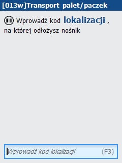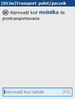 Proces rozpoczyna się od odczytania kodu kreskowego nośnika, który ma zostać przetransportowany na lokalizację wydań. Pod klawiszem F3 dostępna jest lista nośników obejmująca te, z którymi nie jest związany żaden aktualny proces w ramach pakowania, np. Pakowanie lub Bez przepakowania.