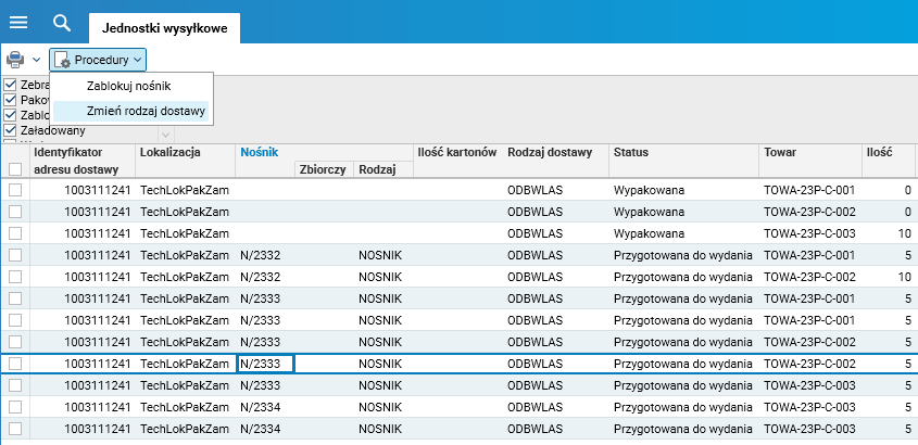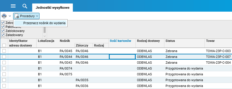 W związku z powyższym w słowniku Jednostki wysyłkowe dodano następujące procedury: