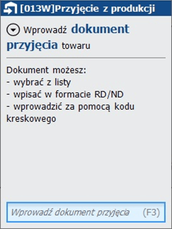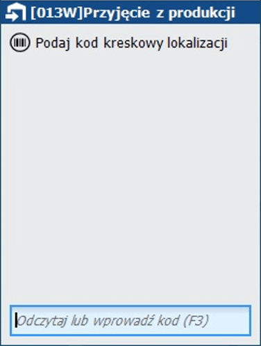 Pierwszym krokiem przyjęcia z produkcji jest podanie lokalizacji, na której będziemy przyjmować towar. Jeśli na magazynie znajduje się tylko jedna lokalizacja dla przyjęć z produkcji, zostanie ona wybrana automatycznie. Pod klawiszem F3 została na udostępniona lista lokalizacji, które są lokalizacjami dla przyjęć z produkcji.