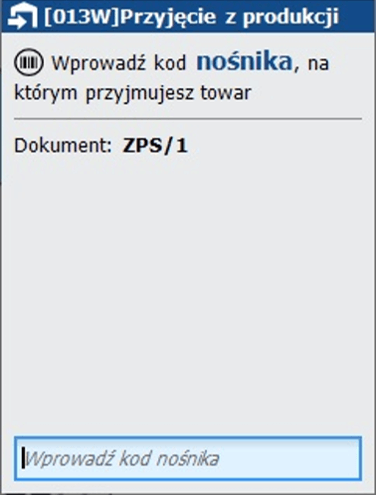 Wprowadzamy kod kreskowy nośnika, na który zostanie przyjęty towar. Opcjonalnie możemy zostać także poproszeni o podanie rodzaju nośnika, którego kod kreskowy wprowadziliśmy.