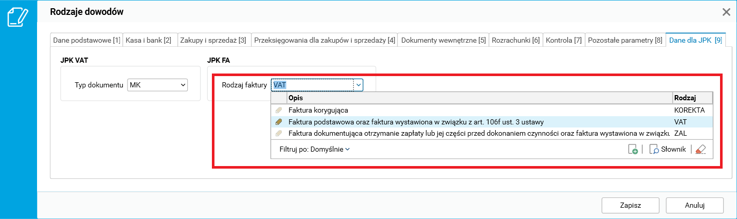 Rys. Pole Rodzaj faktury w zakładce Dane dla JPK [9] w słowniku Rodzaje dowodów