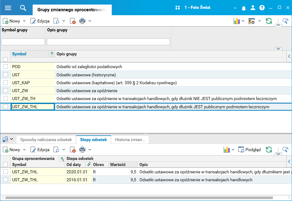 W słowniku Grupy zmiennego oprocentowania dodano nową grupę o symbolu UST_ZW_THL, która będzie stosowana do obliczania odsetek ustawowych za opóźnienie w transakcjach handlowych, w których dłużnikiem jest podmiot publiczny leczniczy. Dla tej grupy uzupełniono stopę odsetek obowiązującą od 1 stycznia 2020 roku, która wynosi 9,5% w stosunku rocznym. Zmieniono również opis grupy UST_ZW_TH, dostosowując go do obecnego zastosowania.