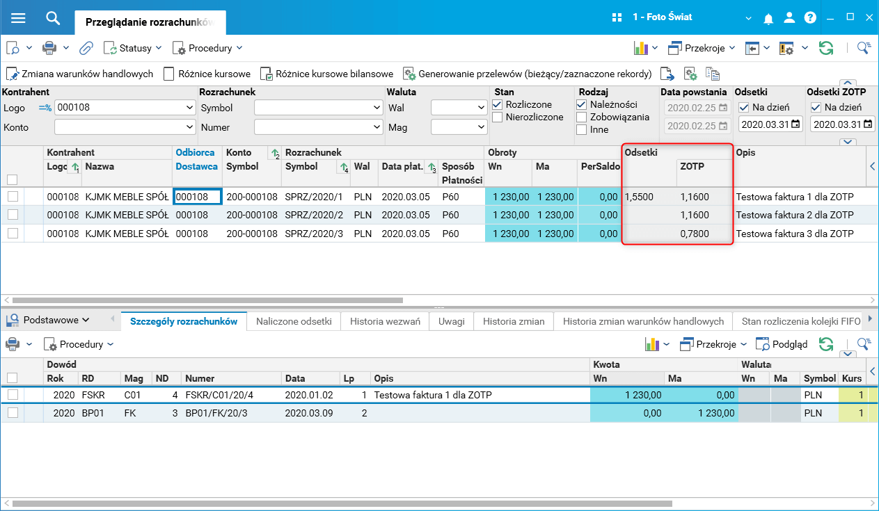 W słowniku Przeglądanie rozrachunków po włączeniu filtra Odsetki;Na dzień i Odsetki ZOTP;Na dzień istnieje możliwość podglądu kwoty odsetek zwykłych i odsetek ZOTP. Wartość tych odsetek wyliczana jest na dzień podany w ww. filtrze, w przykładzie jest to 2020.03.31.